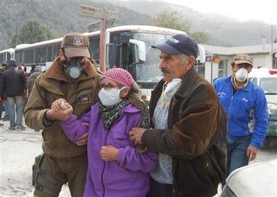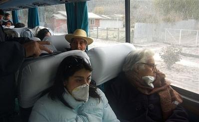 智利當地時間6日,柴騰火山附近的村民帶著防護口罩開始撤離。