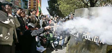 示威群眾向使館扔石塊和鞭炮,要求降下使館的旗子。警察發射催淚彈和水槍,運用防暴警車,與示威者發生沖突。至少有1名警察和2名示威者受傷。埃拉爾多的一位市議員說,“因為警察的鎮壓暴力我們失去了一場戰斗,但是明天或某一天我們還會再來燒使館”。警察用防暴車擋住使館的主要入口。示威者高呼“正義,正義”的口號,曾沖破警戒線,威脅要燒使館的大樓。前國防部長曾卷入2003年10月造成67人死亡和400人受傷的事件,那次事件以后當時的德拉索達總統被迫辭職。民意測驗表明,莫拉萊斯總統在埃拉爾托市的民眾支持率高達70%.(管彥忠)
