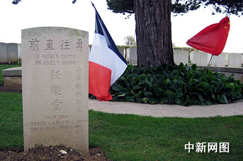 據(jù)了解,第一次世界大戰(zhàn)期間,約十四萬中國勞工遠(yuǎn)渡重洋來到歐洲前線。他們主要集中在法國北部從事戰(zhàn)地后勤的工作,如維修道路、營房,挖掘戰(zhàn)壕,裝卸彈藥,救護傷員,掩埋尸體等。一九一七年八月,中國政府正式對德宣戰(zhàn)后,部分華工加入法軍,直接參加戰(zhàn)斗。一九一八年九月至十一月,德國等同盟國先后戰(zhàn)敗投降,華工為中國爭得戰(zhàn)勝國地位立下汗馬功勞,但同時也付出了沉重代價:中國勞工中有兩萬人再也沒能踏上故鄉(xiāng)的土地,這些客死他鄉(xiāng)的中國勞工大部分安葬在法國北部諾萊特等墓園中,每個人的墓碑上都刻有中文的銘文。