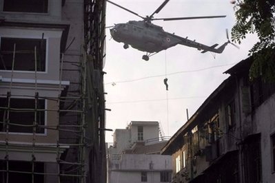 印度特種兵沖入孟買一家猶太人中心,試圖救出在建筑內被激進分子劫持的多名人質。電視新聞畫面顯示,特種兵從猶太人上空的直升機由繩索滑下,而在地面其他軍人也沖入中心所在的建筑物。與此同時,保安部隊也仍在泰姬陵酒店和奧布羅伊酒店內搜剿槍手。