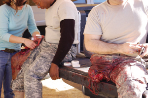 訓(xùn)練現(xiàn)場(chǎng)一個(gè)最震撼人心的場(chǎng)面:軍車被炸后,“傷兵”股動(dòng)脈會(huì)向外“噴血”。