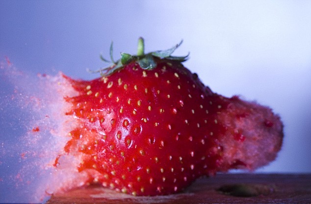 中新網3月26日電 據英國《每日郵報》報道,疾速飛行的子彈橫穿過草莓的瞬間會帶來怎樣的視覺沖擊?藝術家Alan Sailer使用氣槍、相機以及圖片編輯軟件,為我們呈現了這一瞬間的視覺盛宴。