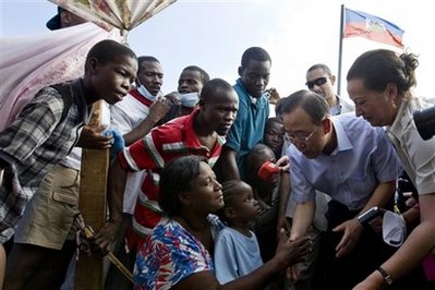 聯(lián)合國秘書長潘基文一行17日在海地了解地震造成的損失并掌握了第一手的災(zāi)情資料。面對嚴(yán)峻的救援情況,日漸絕望的海地災(zāi)民,在被問到是否有足夠的救援物資滿足數(shù)以百萬計的災(zāi)民時,潘基文說:“我真心希望并呼吁海地人民要更加耐心”,他還表示不希望看到發(fā)生騷亂。