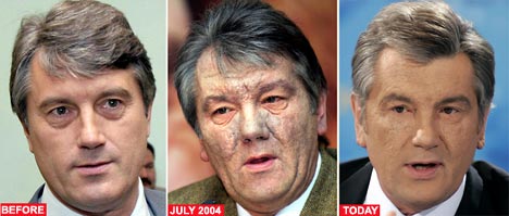烏克蘭總統(tǒng)尤先科3年前因遭人投毒毀容,一張英俊的臉變得粗糙黯淡不堪,布滿疙瘩。3年的時間過去,隨著身體的漸漸恢復(fù),尤先科也終于大致恢復(fù)到往昔的容顏。