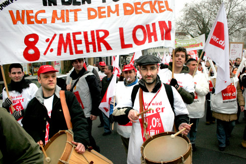 上周四在波茨坦進(jìn)行的最后一輪勞資談判最后宣告破裂,工會(huì)隨即醞釀罷工。此次罷工的目的是要求大幅提高工資。工會(huì)要求為聯(lián)邦和市鎮(zhèn)機(jī)關(guān)130萬(wàn)公務(wù)員一年提高工資8%,或者起碼每月漲工資200歐元,但是資方卻提出兩年內(nèi)分3個(gè)階段漲5%的條件,而且同時(shí)還要求延長(zhǎng)工作時(shí)間。