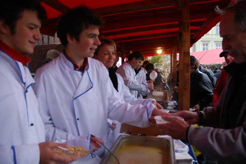 6年來布拉格市長貝姆第一次沒有親自操勺打湯,據說這位跑過馬拉松,登過珠峰的運動愛好者人在南極,他的太太拉德米拉.貝娃帶著兩個兒子為市民服務,向每一位領湯的人轉達她丈夫的節日問候。