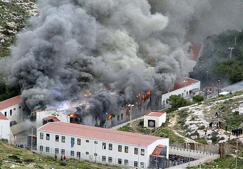 2月18日,在意大利南部蘭佩杜薩島,濃煙從一處移民收容中心升起。據當地警方稱,當天,一些被拘留在此的非法移民試圖逃跑失敗后,便縱火焚燒該收容中心,造成多人受傷。