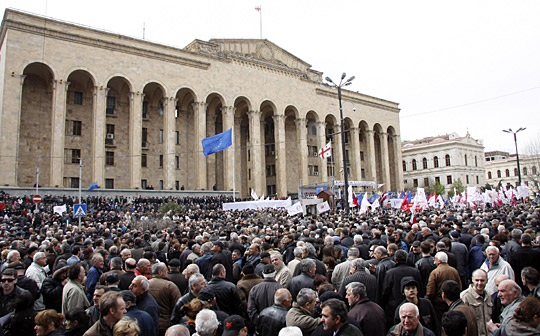 大約2萬名反總統(tǒng)薩卡什維利的示威者周五(10日)聚集在議會(huì)外。薩卡什維利早前要求與反對(duì)派進(jìn)行對(duì)話,并保證改善該國(guó)民主。但薩卡什維利拒絕辭職。
