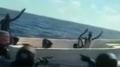 據英國媒體報道,5月4日,法國海軍將抓獲11名索馬里海盜的錄像公布于眾。法國海軍在塞舌爾島以外海域俘虜11名索馬里海盜。當時,這些海盜蔣法國軍艦誤認為是商船。據報道,事實上,海盜們想襲擊的是參與歐盟打擊海盜行動、在當地海域巡邏的法國導彈護衛艦“雪月號”。