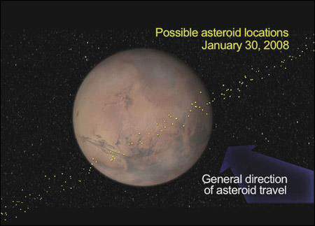 美國宇航局上月21日發布觀測結果說,一顆名為2007WD5的小行星本月末將穿越火星繞日軌道,其間小行星有可能與火星碰撞。