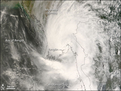 美國“今日宇宙”(universetoday)網站公布的衛星照片顯示,強熱帶風暴“納爾吉斯”2日開始在緬甸伊洛瓦底省海基島附近登陸,風暴登陸時的最大風力超過190公里。風暴登陸后轉向緬甸三角洲地區,一路掃蕩伊洛瓦底省、勃固省和仰光省,3日凌晨突然抵達仰光市中心。屬于第三級熱帶氣旋的“納爾吉斯”一路沿仰光西南約220公里的伊江江口登陸北上,沿途摧毀無數的建筑物。