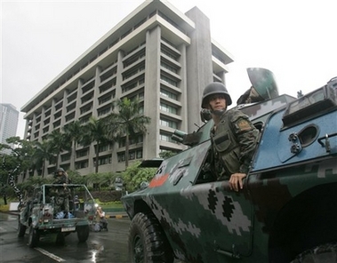 據報道,這些菲律賓叛軍29日占領馬尼拉半島酒店,要求總統阿羅約辭職。政府給予那些士兵的投降限期已屆滿。政府此前要求這些士兵限期無條件投降。