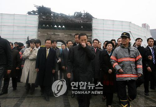 李明博視察崇禮門火災(zāi)現(xiàn)場表情沉重一言不發(fā)(圖)
