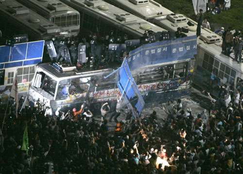另外,韓國首都首爾昨天清晨的4萬人燭光集會示威演變成暴力沖突,延至日出后才平息。示威者用棍棒攻擊警員,又用梯子擊碎用作路障的防暴巴士的窗戶,并試圖推翻巴士,警方則以防暴盾牌還擊,據報雙方更曾在巴士車頂上開戰。組織示威者表示最少有20名示威者受傷,首爾大學醫院則指治療過6個人,已全數出院。據悉亦有警員受傷,及11名示威者被扣留問話。