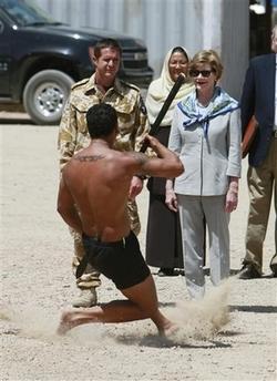 頂著大太陽觀賞新西蘭大兵演出的毛利戰舞,勞拉相當愉快,不過她始終不動如山,不像布什總統出訪時,每逢舞蹈表演一定會共襄盛舉,從非洲、白宮到新奧爾良,當布什遇上舞蹈團總免不了親身參與,在中亞還要一起舞劍。布什給人的印象就好像沒出過國一樣,覺得什么都是那么的好玩。