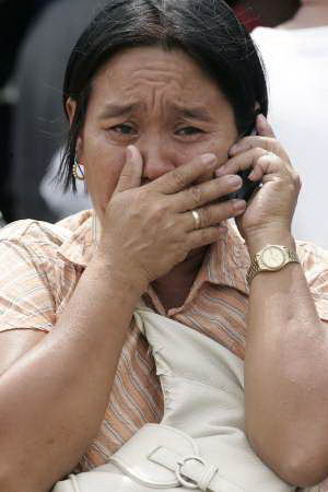 一名哭泣的婦女等待親人的消息。