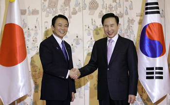 1月11日,在韓國首都首爾的總統府,韓國總統李明博(右)與到訪的日本首相麻生太郎握手。麻生太郎當日開始對韓國進行為期兩天的訪問。