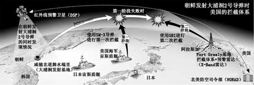 此外,韓國軍方預測,朝鮮如果發射能夠威脅美國本土的大浦洞2號改良型導彈,美國將分兩個階段予以攔截。大浦洞2號導彈發射后,朝鮮半島上空的美國紅外線預警衛星(DSP)將首先發現情況。導彈尾部的火焰在太空中也能得到確認。預警衛星將向美國的所有導彈防御體系發送警報。導彈升空后,第一階段的攔截體系開始運作。位于東海的美國海軍宙斯盾艦將通過相控陣雷達實時預測導彈的軌跡。如果大浦洞2號導彈接近日本列島,宙斯盾艦將發射SM-3導彈進行攔截。美國第7艦隊擁有夏洛號巡洋艦(CG-67)和斯特塞姆號驅逐艦(DDG-63)等九艘宙斯盾艦,一次可以發射多枚SM-3導彈。盡管日本海上自衛隊的宙斯盾艦上也裝備有SM-3導彈,但是由于日本的和平憲法禁止自衛隊在日本境外使用武器,所以在攔截導彈問題上受到了限制。
