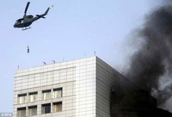據英國《每日郵報》報道,孟加拉國軍方13日出動一架直升機,參加首都達卡巴舒達拉購物城火災現場的救援行動。直升機從發生火災現場屋頂救出了幸存者,大火當時正在那一高層建筑物的上層快速蔓延。