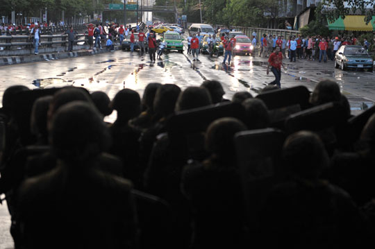 軍方凌晨開始對占據曼谷勝利紀念碑主要路口的示威者采取驅散行動,引發激烈沖突。沖突點距離“紅衫軍”抗議主場——曼谷總理府——只有數公里。軍方和示威者以催淚瓦斯、實彈和汽油彈互相攻擊。至中午時分,軍方向市中心的示威者開槍并發射高壓水炮。