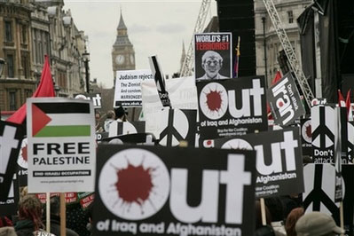 “停止戰爭聯盟”發言人表示:“伊拉克被占領的結果,是估計導致100萬人死于暴力。”他還提到阿富汗戰事,指布朗不斷增兵阿富汗,可能成為另一場像伊拉克的災難。格拉斯哥亦有幾百名示威者高舉“撤出伊拉克和阿富汗”的標語牌。