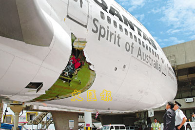據香港《文匯報》報道,這架澳航QF30客機,25日晨9時由香港起飛,原定當地時間晚上約10時飛抵墨爾本,但在起飛約1小時后,機身近右邊機翼部分突然傳出巨響,機師決定緊急降落馬尼拉,11時左右安全著陸后,機上346名乘客和19名機組人員無人受傷。