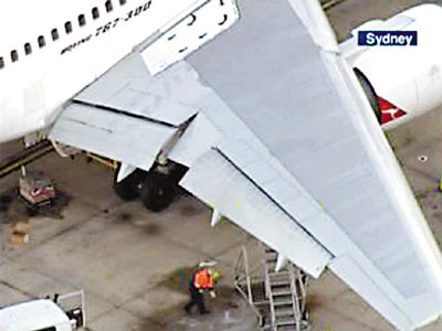 出事的澳航波音767客機迫降后由工作人員檢查。