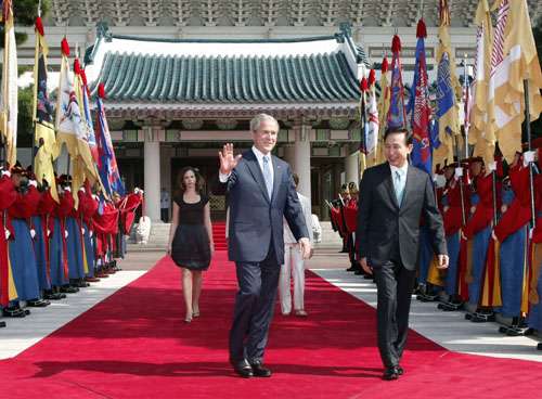 據香港《大公報》報道,李明博六日上午在青瓦臺以三軍儀仗隊歡迎布什后,即進行韓美高峰會談,雙方就今后同盟的發展方向一致認為,有必要繼續加強聯合防御力量、執行移交戰時作戰指揮權、履行駐韓美軍基地遷移及重新部署的協議。
