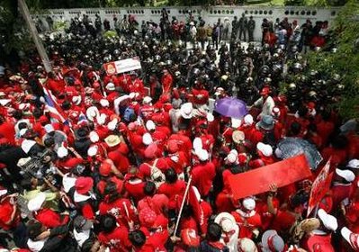 中新網4月9日電 泰國局勢轉趨緊張,超過10萬名支持前總理他信的“紅衫軍”示威者,8日在曼谷圍堵總理府等多幢政府建筑物,向政府作出“最后攤牌”,要求總理阿披實下臺。