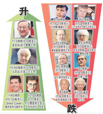 富豪門坎已大為降低,去年上榜的身家最少要有8000萬英鎊,今年降至5500萬英鎊,是2003年起首次要降低門坎,盡管如此,部分富豪仍難免跌出榜外。