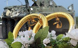 由一輛貨真價實的裝甲運兵車引導的婚禮車隊沿著列寧大街飛馳。龐大的裝甲運兵車裝飾著彩帶、蝴蝶結和一塊寫著“新郎哥們”的牌子。盡管在由外國品牌轎車組成的車隊中顯得有些別扭,但的確吸引了路人的眼球。