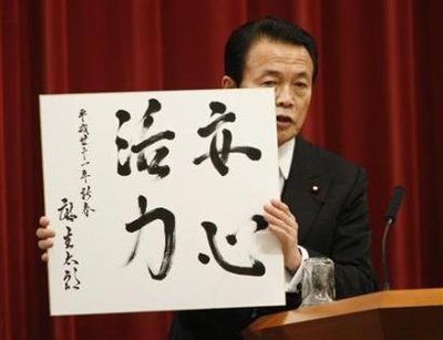 麻生當首相后,因為幾次在電視現場直播的國會發言中念了錯別字,因此有了“錯別字大王”的雅稱。而日前親筆手寫的四個字中,又有一個字寫錯,他留給國民的那一種“沒文化”的印象顯得更深。