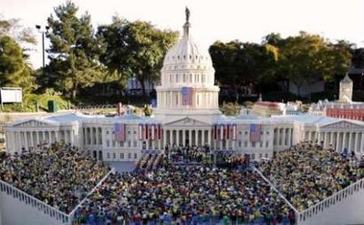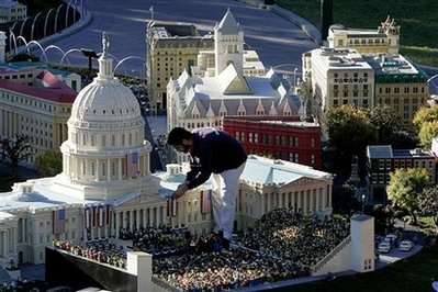 中新網1月17日電 為慶祝奧巴馬20日就任美國新總統,模型玩家麥克因提爾15 日在加州卡爾斯巴德市樂高樂園以樂高積木搭成一座仿真總統就職典禮的模型。