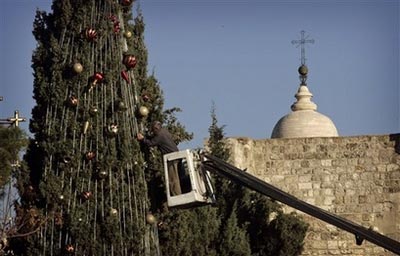 15日當(dāng)天,伯利恒大街上紛紛掛起了鈴鐺和圣誕老人形狀的燈飾。盡管在西岸地區(qū)只有一部份居民會慶祝圣誕節(jié),但是伯利恒被認(rèn)為是耶穌誕生地,因此當(dāng)?shù)孛磕甑氖フQ氣氛也會非常熱烈。