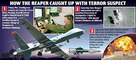 據(jù)英國(guó)媒體11月25日?qǐng)?bào)道,美國(guó)軍隊(duì)22日曾對(duì)巴基斯坦西北部落地區(qū)發(fā)動(dòng)導(dǎo)彈襲擊,并使得包括英籍恐怖頭目拉希德-拉烏夫在內(nèi)的至少5名恐怖分子死亡。美軍最新披露的消息顯示,駐阿美軍當(dāng)天是在得到準(zhǔn)確的地面情報(bào)后,遠(yuǎn)程遙控一架正在附近巡邏的無人機(jī)前往發(fā)動(dòng)襲擊的。