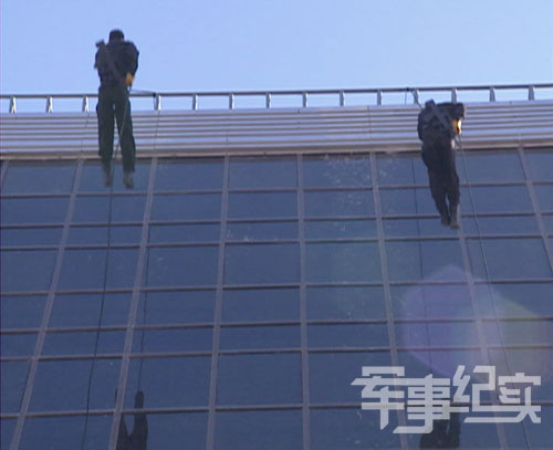 僅僅用時20多秒,惠寶林便從地面抵達了十層大樓的樓頂。選擇好位置,惠寶林便悄悄地固定好繩索,準備下滑。