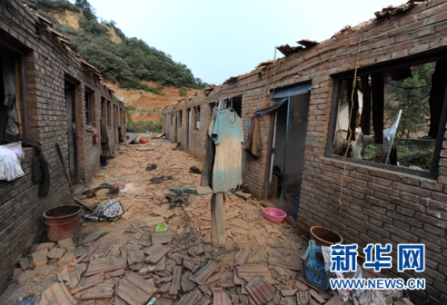 爆炸點(diǎn)西北方向是位置稍低的宿舍區(qū),屋頂上的瓦片大都被掀掉,靠近爆炸地點(diǎn)的幾排房屋都被推到,稍遠(yuǎn)的房子屋頂損毀嚴(yán)重,許多房梁被飛石砸斷,瓦片墜落屋內(nèi),許多礦工的床上掉滿了大小不一的石塊、瓦片。