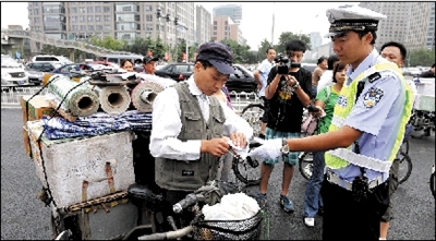 昨天上午9點,記者在東單路口看到,8名民警“把守”在路口4個方向,由于正值上班高峰,路口騎車人較多,大部分人能等待紅燈,幾名想“闖關”的騎車人被民警和協管員攔住。市民小陳騎電動自行車載人,被執勤民警攔下并處以罰款20元。記者注意到,民警處理的多是自己加裝動力裝置的三輪車。“自行加裝動力裝置很危險。”民警說,行人、非機動車的違法行為主要有騎車帶人、逆行、闖紅燈等。昨天上午兩個小時內,僅東單路口一處,民警就處罰了20多起行人、非機動車的違法行為。