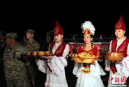 在奧塔爾市火車站站臺上舉行的簡樸而隆重的歡迎儀式上,用中、俄兩種文字書寫的“熱烈歡迎‘和平使命-2010’聯合反恐軍事演習中方參演部隊”的橫幅格外醒目,哈方軍樂隊高奏中、哈兩國國歌,3位哈薩克斯坦盛裝少女手捧當地特色的美酒、美食,獻給風塵仆仆的中方參演官兵。隨后,站臺另一側,中方參演部隊列車第一車隊攜行裝備,也在緊張有序地進行卸載。