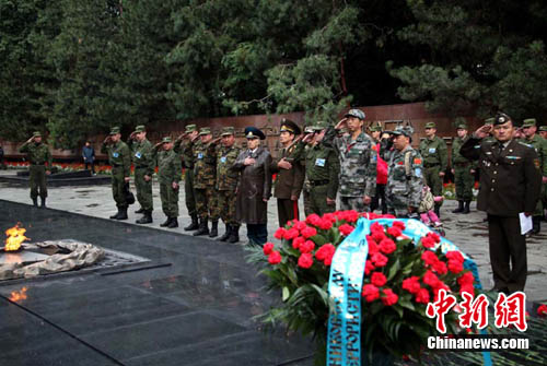 中新網哈薩克斯坦阿拉木圖9月20日電 (記者 孫自法)“和平使命-2010”聯合反恐軍事演習中、俄等參演部隊代表一行,19日專程前往阿拉木圖市潘菲洛夫勇士紀念公園,獻花憑吊“二戰”時參加莫斯科保衛戰的反法西斯英烈。