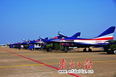 昨日中午12點(diǎn)15分,中國(guó)空軍八一飛行表演隊(duì)已經(jīng)飛抵珠海。伴隨著飛機(jī)引擎的轟鳴,3架以藍(lán)、白、紅為主色的殲10出現(xiàn)在珠海航展中心上空。3架飛機(jī)宛如三把直刺長(zhǎng)空的利劍,連續(xù)兩次掠過(guò)藍(lán)天,然后相繼在珠海機(jī)場(chǎng)降落。約12點(diǎn)45分,另外4架殲10也相繼到達(dá)(見(jiàn)圖,陳俊攝)。這意味著換裝殲10飛機(jī)后的航展期間,八一飛行表演隊(duì)每天都將進(jìn)行一場(chǎng)飛行表演,準(zhǔn)備了18套動(dòng)作,每次表演時(shí)間約22分鐘。