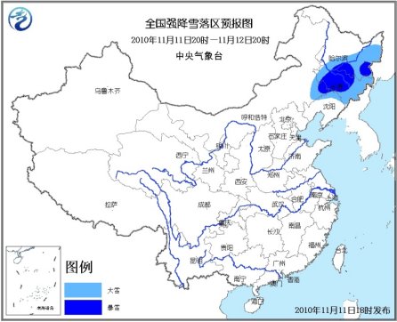 11月11日20時到12日20時,內蒙古東部偏南地區、遼寧北部、吉林大部、黑龍江東南部等地有大雪(5~9毫米),其中,內蒙古東部偏南地區、吉林中部、黑龍江東南部等地的部分地區有暴雪(10~20毫米)。