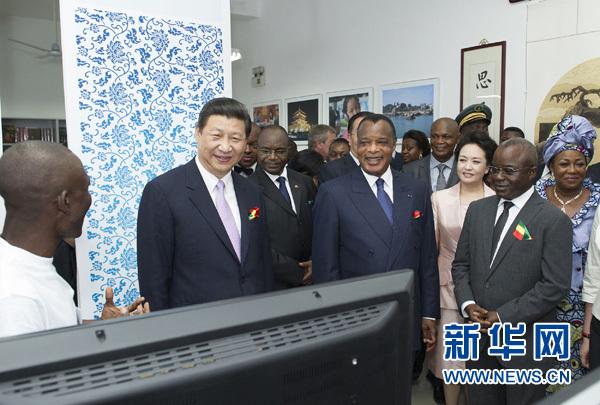 習(xí)近平又來到位于二層的中國館,這里擺放著介紹中國的圖書和光盤,電視里播放著中國文化的節(jié)目。剛果師生們從這里開始,感知中國、了解中國、愛上中國。