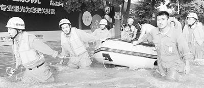 10月10日,來余姚支援的杭州消防支隊武警官兵在余姚市南西路幫助轉移被困群眾。