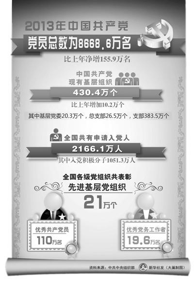 中央組織部最新黨內(nèi)統(tǒng)計(jì)數(shù)據(jù)顯示,截至2013年底,中國共產(chǎn)黨黨員總數(shù)為8668.6萬名,比上年凈增155.9萬名,增幅為1.8%;黨的基層組織總數(shù)達(dá)430.4萬個,比上年增加10.2萬個,增幅為2.4%。數(shù)據(jù)表明,中央關(guān)于黨員隊(duì)伍建設(shè)和基層黨組織建設(shè)的新部署新要求得到了較好落實(shí)。