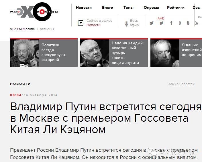 “莫斯科回聲”廣播電臺:在會見李克強時,普京表示,將在亞太經合組織成員國領導人非正式會晤期間,與習近平主席在北京舉行會晤。在不到一個月的時間內,兩國高層領導先后會面,其重要意義不言而喻。