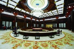 雁棲湖國際會議中心集賢廳,APEC領導人圓桌會議即在此召開,其設計亮點是木制裝修與景泰藍技藝結合。