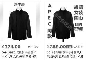 APEC會議上首次亮相的“特色中式服裝”,引起了社會公眾的關注,一些網店的掌柜迅速“嗅到”商機,紛紛推出同款服裝(如圖)。昨天,服裝面料供應商表示只提供私人定制,其他商家無權使用同款面料,網上熱銷的同款服裝均為仿制。