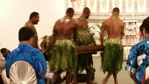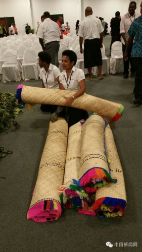 一名斐濟原住民將草席獻至習大大面前,另一人手持鯨魚牙向習大大致祝福語并獻上鯨魚牙。咦,不是剛剛獻過一次嗎?不管那么多了,接過鯨魚牙再次轉交給斐濟禮賓官,禮賓官向獻禮人拍掌并表示感謝。之后,斐濟原住民將草席撤下。
