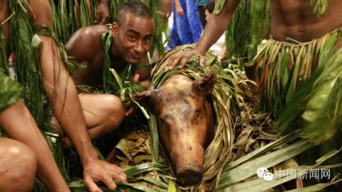 喝完卡瓦汁,斐濟原住民又把烤豬、芋頭什么的抬上來啦,一人還上前致祝福語。習大大點頭致意。斐濟禮賓官代表習大大接受獻品并致謝。然后,原住民將食物抬下。